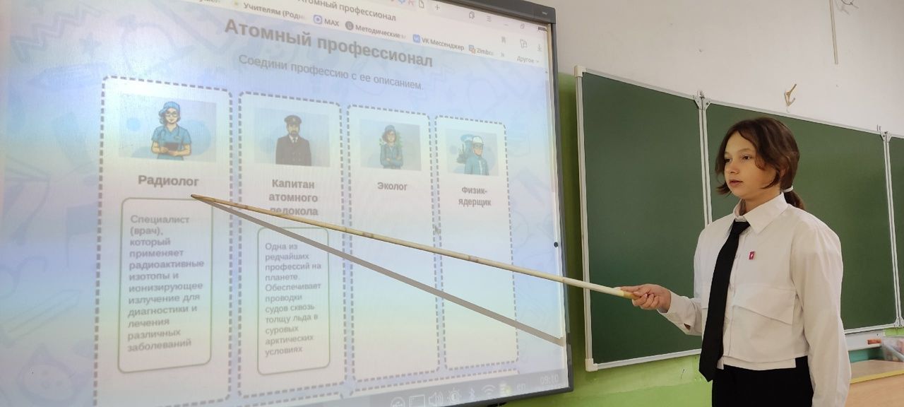 Ребята смотрели видеоролики и презентацию, изучали профессии радиолога, эколога, капитана атомного ледокола, физика-ядерщика, дозиметриста.